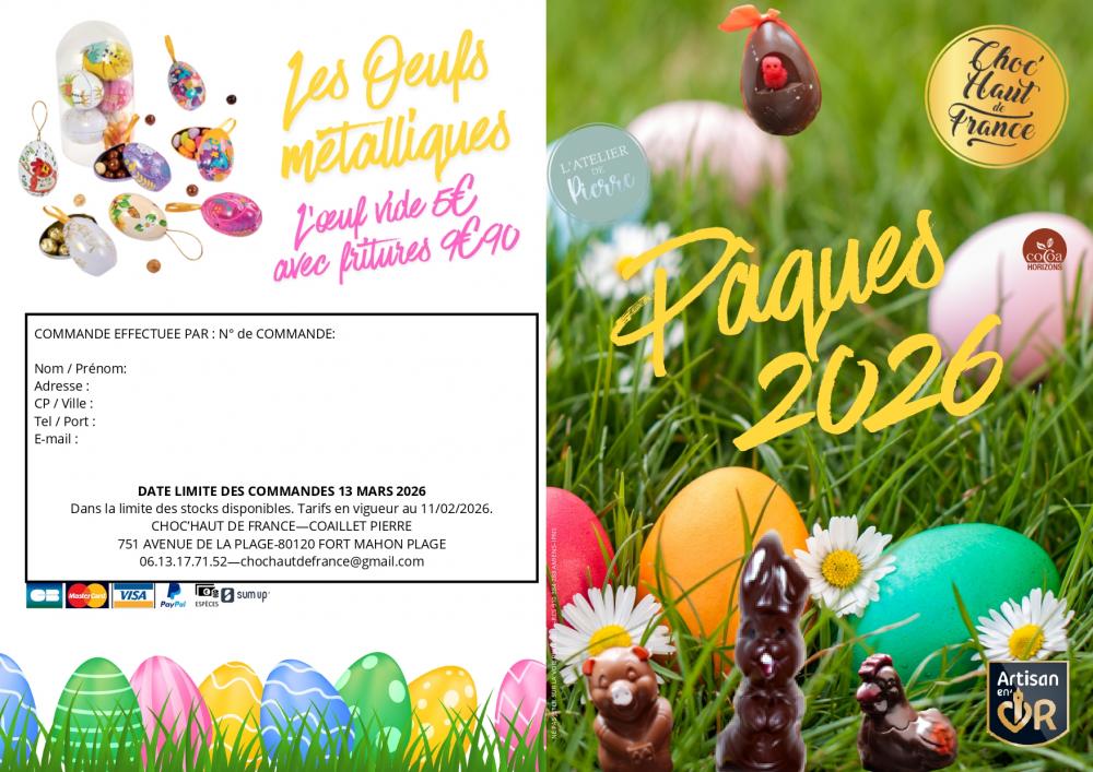 À l’approche du printemps, Choc Haut de France dévoile sa nouvelle collection gourmande pour Pâques 2026, une célébration de la créativité et de la tradition chocolatière. Cette année, nos maîtres chocolatiers ont imaginé des créations exclusives pour émerveiller petits et grands : des œufs richement garnis, des moulages originaux et nos incontournables fritures en chocolat noir, lait et blanc. Pour célébrer Pâques comme il se doit, de nombreuses nouveautés font leur apparition : assortiments de petits oeufs pralinés, poules en chocolat, oeufs nid avec poussin en chocolat, oeufs coquilles craquelées, oeufs cabosse avec friture et bien d'autres encore. Chaque pièce est préparée avec soin dans notre atelier.