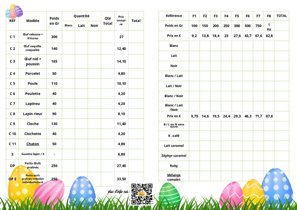 Œufs richement garnis, moulages originaux, fritures en chocolat noir, lait et blanc… et de nombreuses nouveautés : œufs pralinés, poules en chocolat, œufs nid avec poussin, cabosses garnies et bien d’autres créations exclusives.